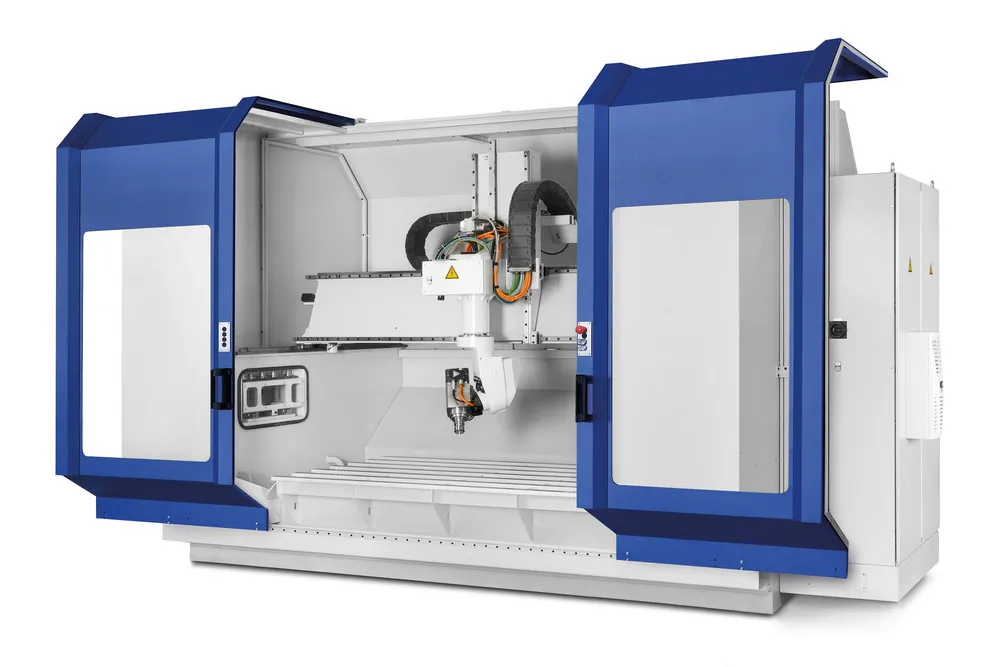 The low-vibration portal frame with its fixed machining table on a stable base convinces by utmost machining quality at maximum feed rates. The machine is completely encased in a protective cabin including ceiling element, while allowing also for an optimum chip removal. The two versions available meet most different customer requirements.
