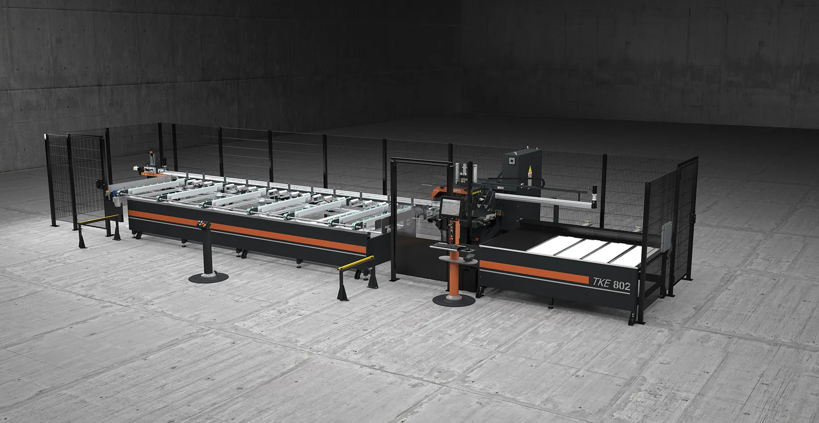 Automatic CNC cutting-off centre with horizontal blade feed, 3 controlled axes, designed for cutting profiles made of aluminium, PVC, light alloys in general. It performs automatic cutting according to predefined and optimized cutting lists. It can perform the bevelled cut on both sides of the profile. The machine is intended to perform cutting at an angle from 45° to 135°. Automatic bar feeder and automatic unloading magazine on the opposite side. It can be fitted with customised horizontal and vertical drilling units for specific automatic machining operations.