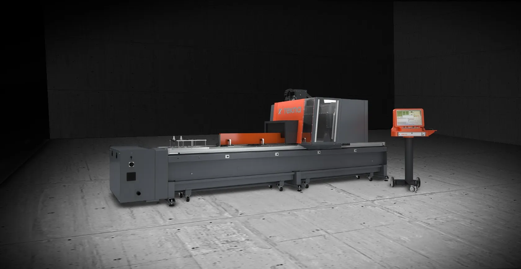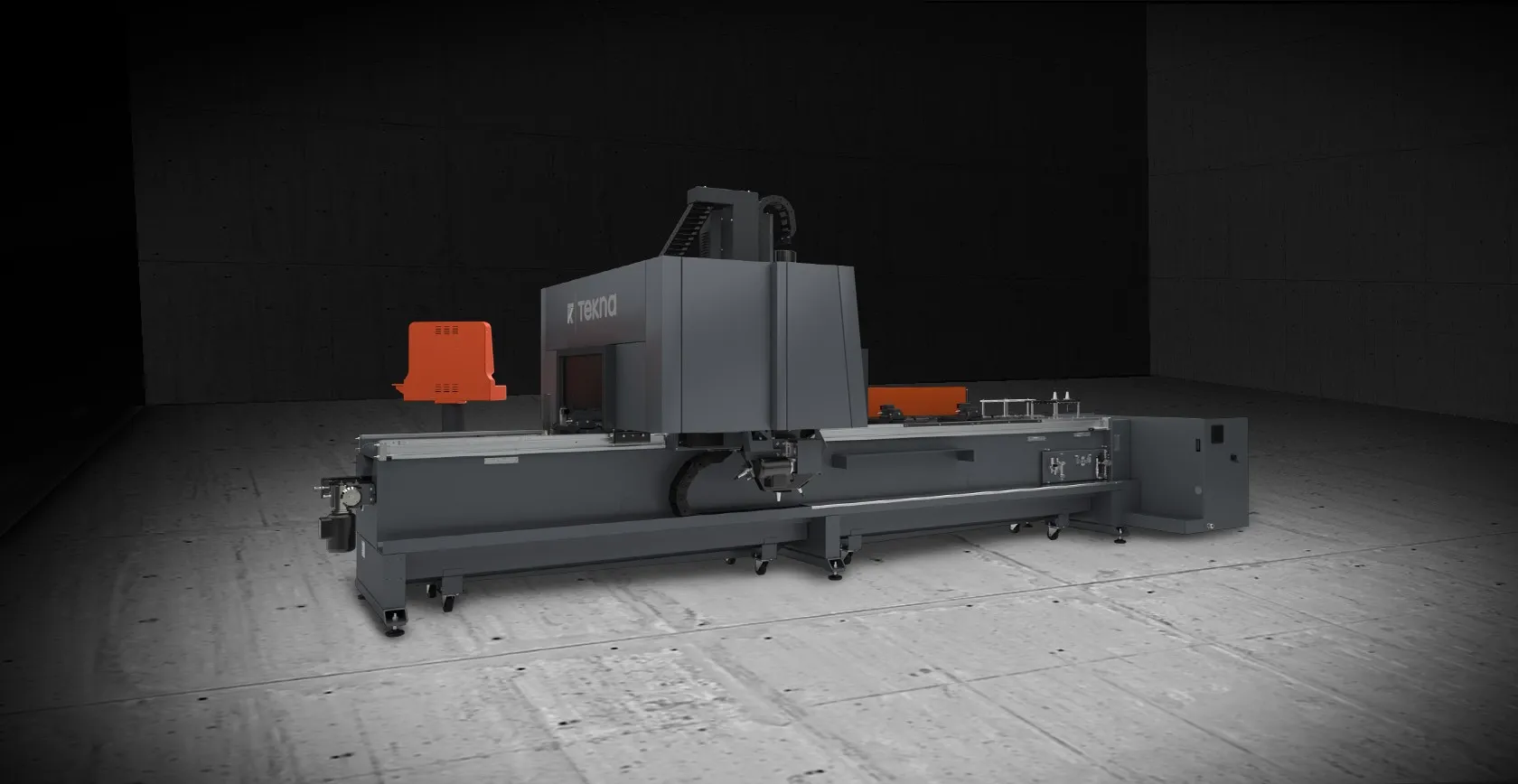 To reduce non-productive times, the 7m machine is equipped with the option of pendulum machining as standard. Profile lengths of up to 3m can be machined alternately with the same or different programs or workpieces. While the machine is working on one side, the other side can be reloaded. Tool magazine with 4 or 8 places for automatic tool change on the left or optionally with 8 places on the machining portal, which is required for pendulum machining. In the scope of delivery, the machine is equipped with a protective cabin on the portal, which protects the operator and reduces the noise level.