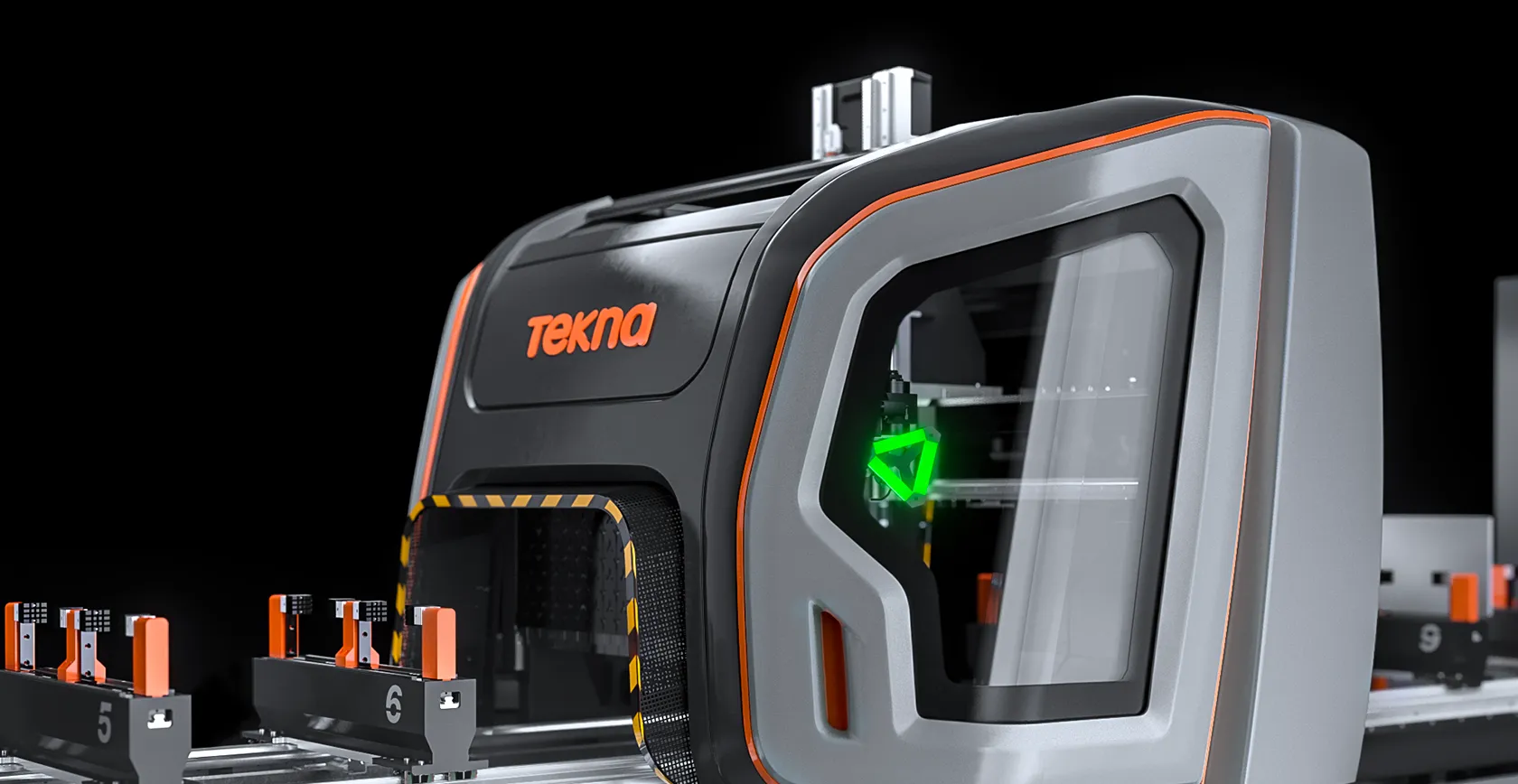 In version with clamp handling system on H and P axes, the machine can be used in dynamic double operation, a work method that enables reducing machine stop times to a minimum, as it enables automatic arranging of the clamps in concurrent operation time with respect to the spindle machining processes in the opposite working field. TKE 954 features a laser scanner for more precise and advanced access control to the machine, raising safety and operator/machine interface standards. In double operation, the laser scanner, unlike the light curtains, allows, from time to time, the appropriate programming of the two separate working areas on the X-axis, increasing the flexibility of use of the machine.