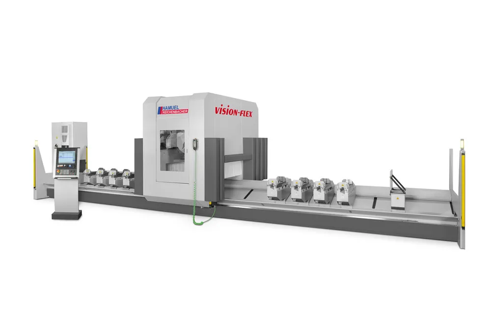 The highly dynamic 5-axes CNC-machine VISION-FLEX is perfect for the advanced processing of aluminium profiles, as it revolutionises the cutting and machining even of larger profile cross-sections. The processing of profiles of up to 7,300 mm in length, three-sided and end-of-profile machining, are only some of the technical highlights of this new machine concept.